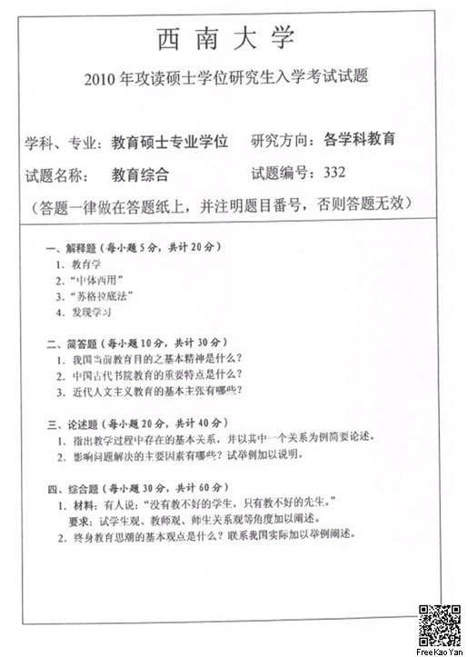 西南大学教育硕士半岛在线注册【333教育综合】半岛在线注册历年真题试题(2010-2014)经典真题5套