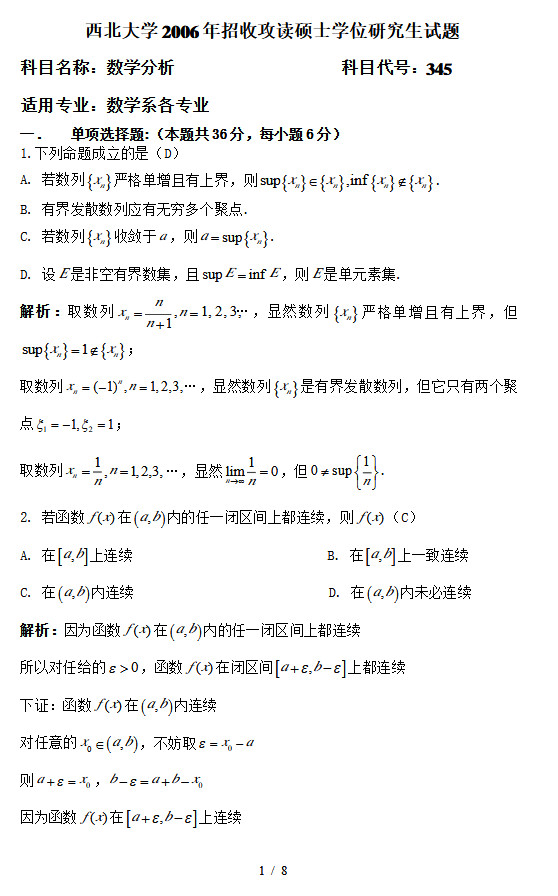 西北大学2006年数学分析半岛在线注册考试试题带详细答案解析
