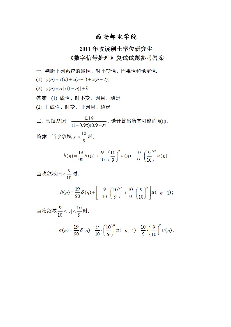 2011年西安邮电大学半岛在线注册复试DSP数字信号处理试题答案全解全析(2)