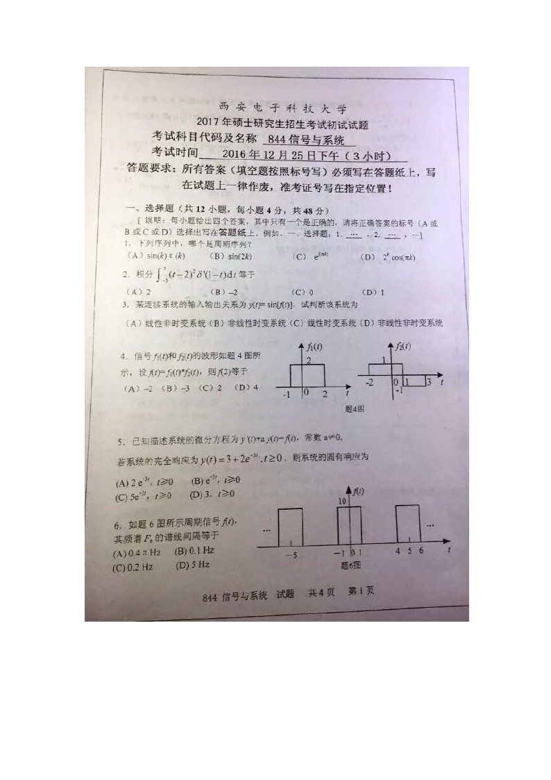 2017西安电子科技大学半岛在线注册信号与系统844真题答案解析