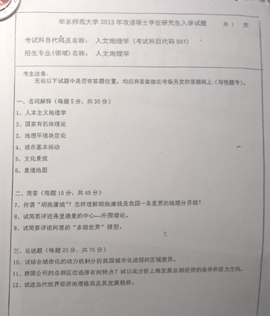 华东师范大学2012年人文地理试题