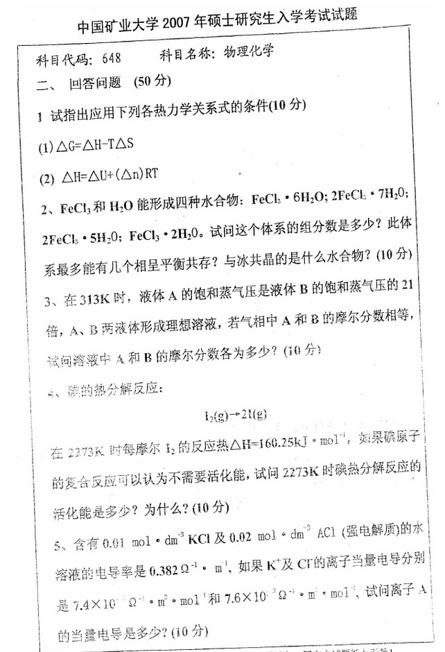 中国矿业大学2007年物理化学半岛在线注册真题(3)