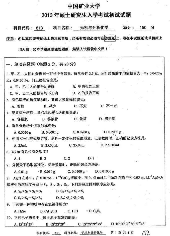 2013年中国矿业大学无机与分析化学半岛在线注册真题