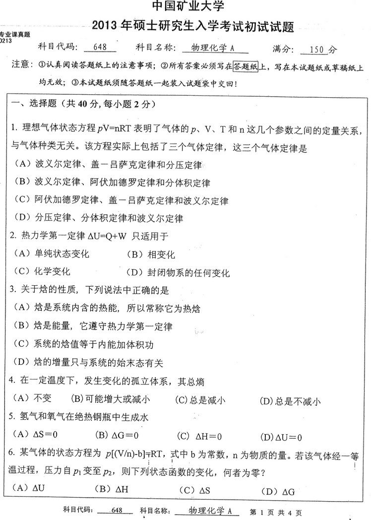 中国矿业大学2013年物理化学半岛在线注册真题