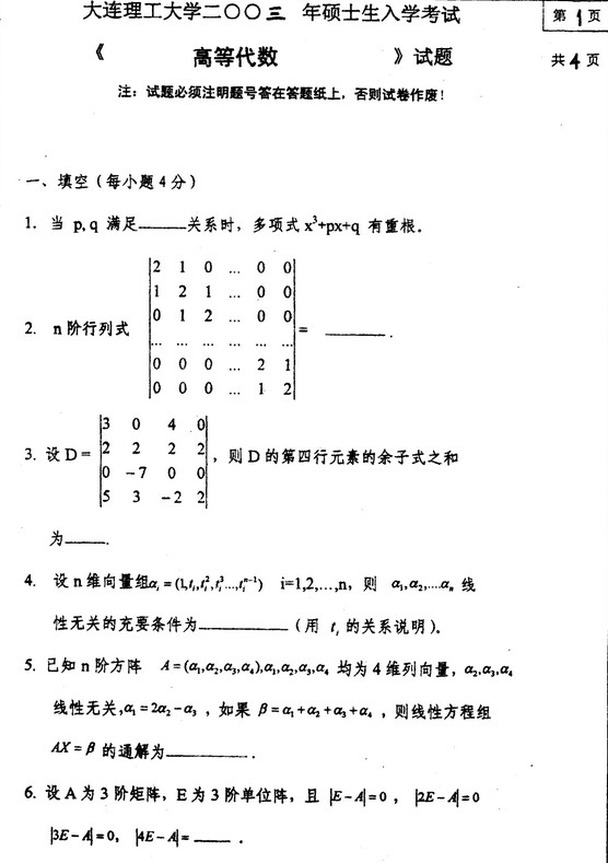 2000-2009年大连理工大学高等代数半岛在线注册试题(8)