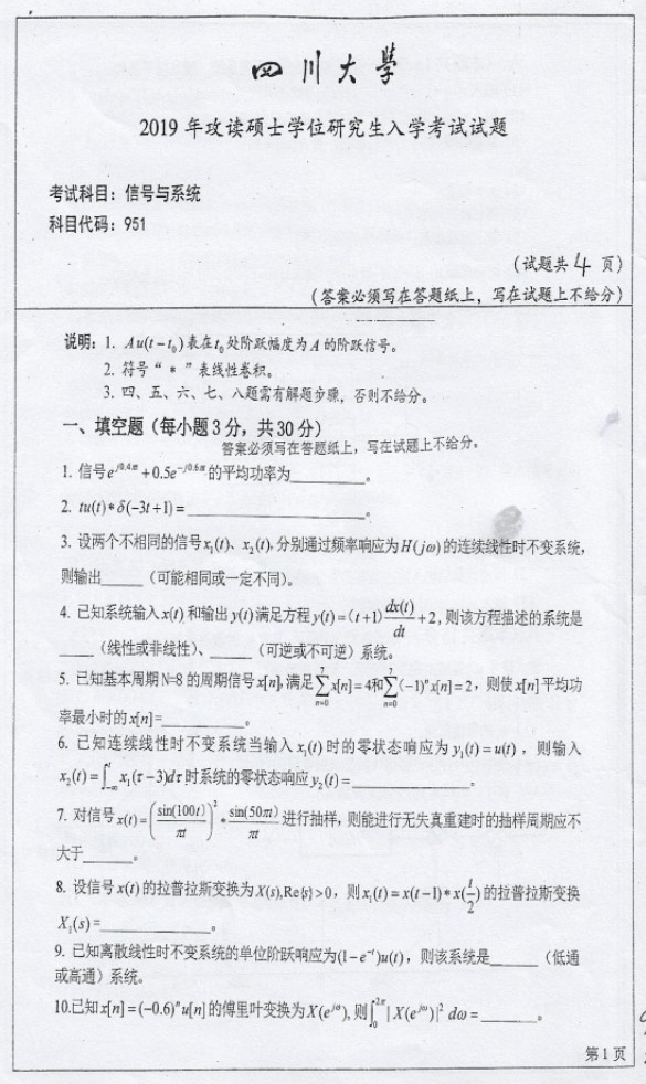 2019四川大学信号与系统半岛在线注册专业课试卷