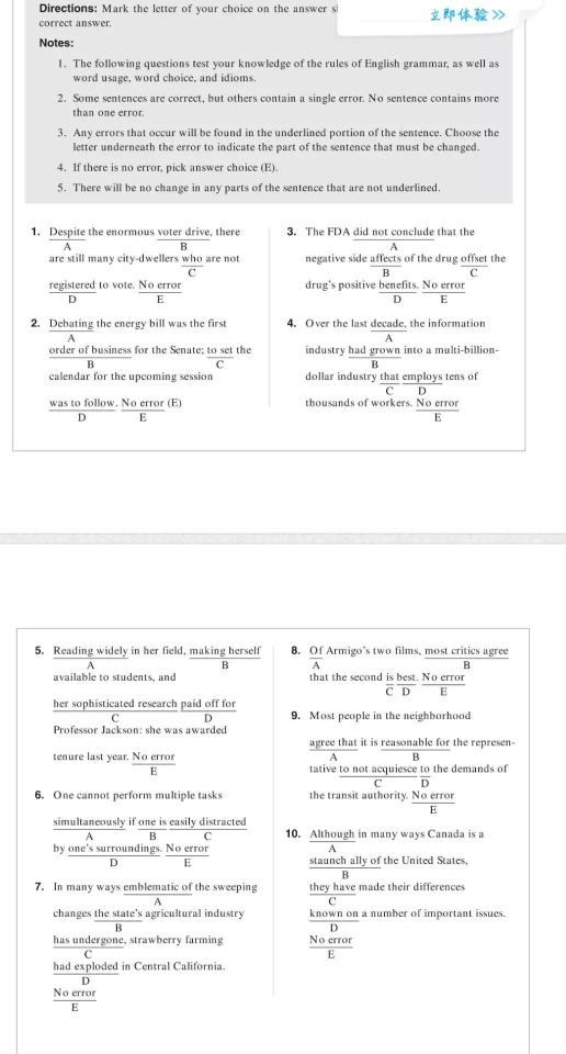ABCDE五个选项,E为无错误。来自SAT真题