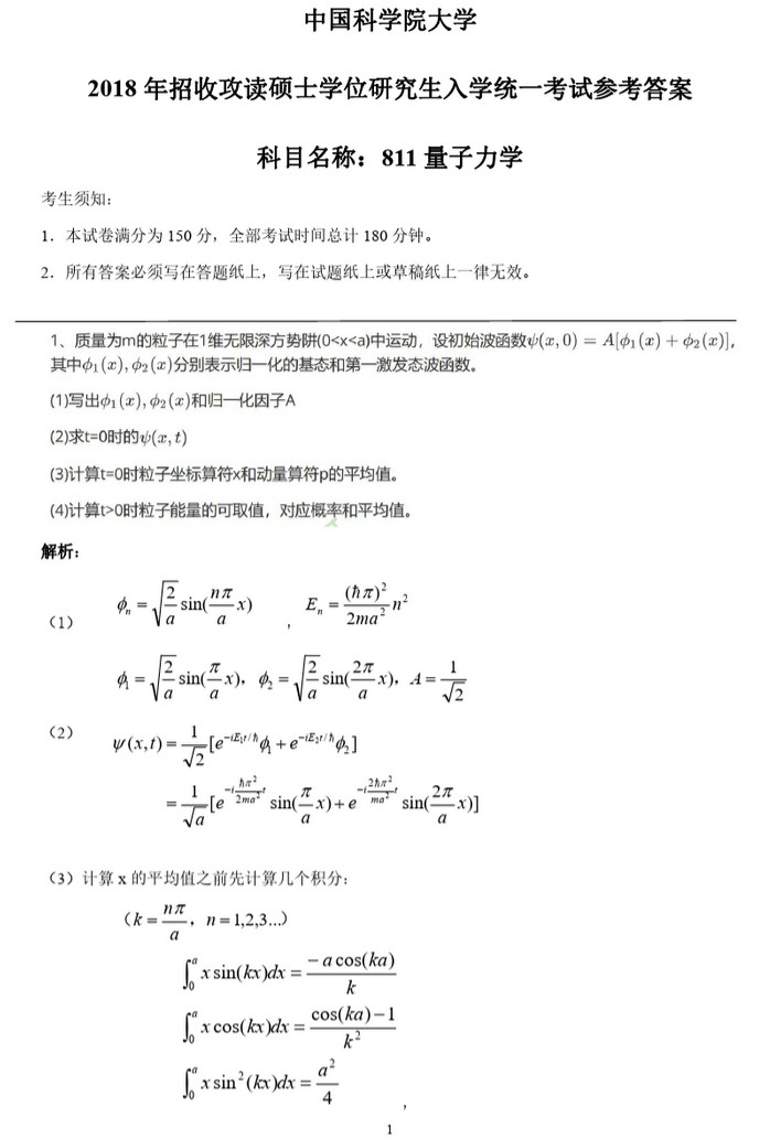 2018年中国科学院大学811量子力学半岛在线注册真题附带详细答案