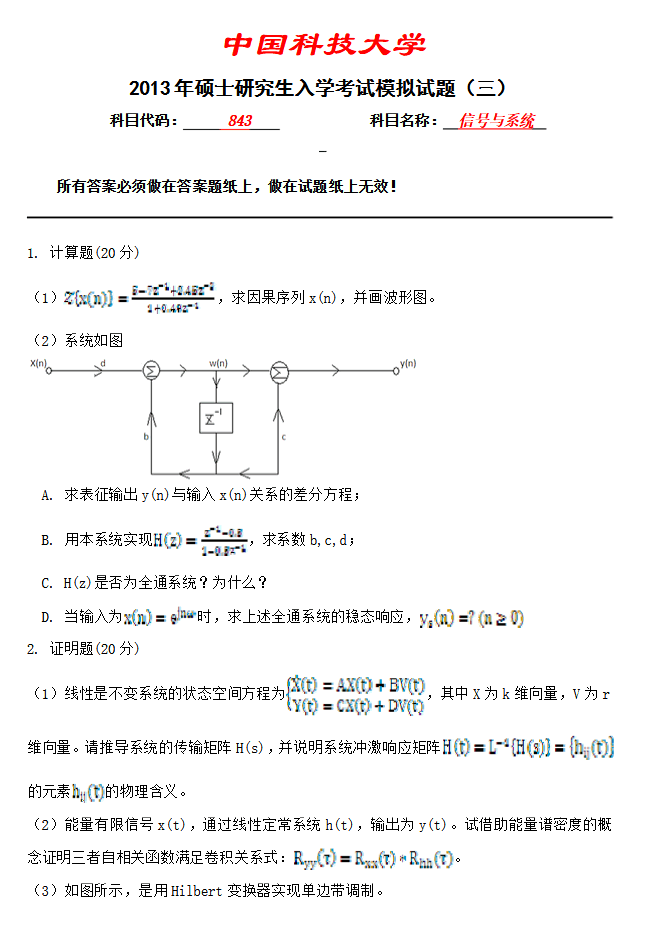 中国科技大学843信号与系统半岛在线注册模拟题三带详细答案