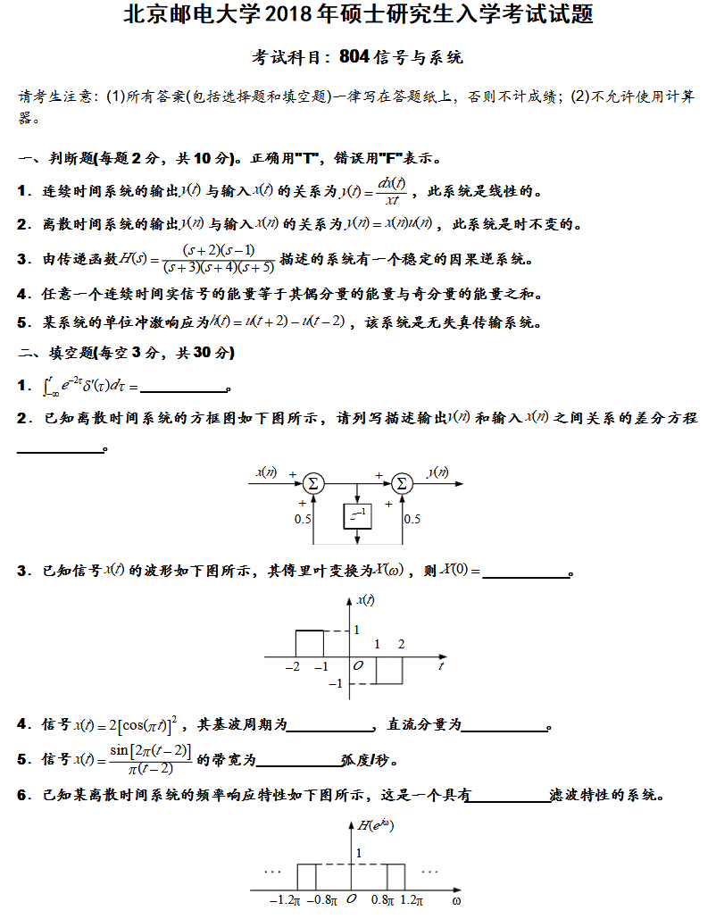 北京邮电大学通信半岛在线注册2018年信号与系统804真题