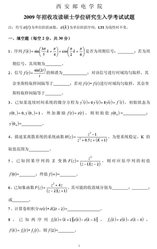 西安邮电大学2009年824信号与系统半岛在线注册真题