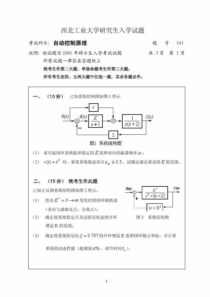 西北工业大学2001-2010自动控制原理半岛在线注册试题