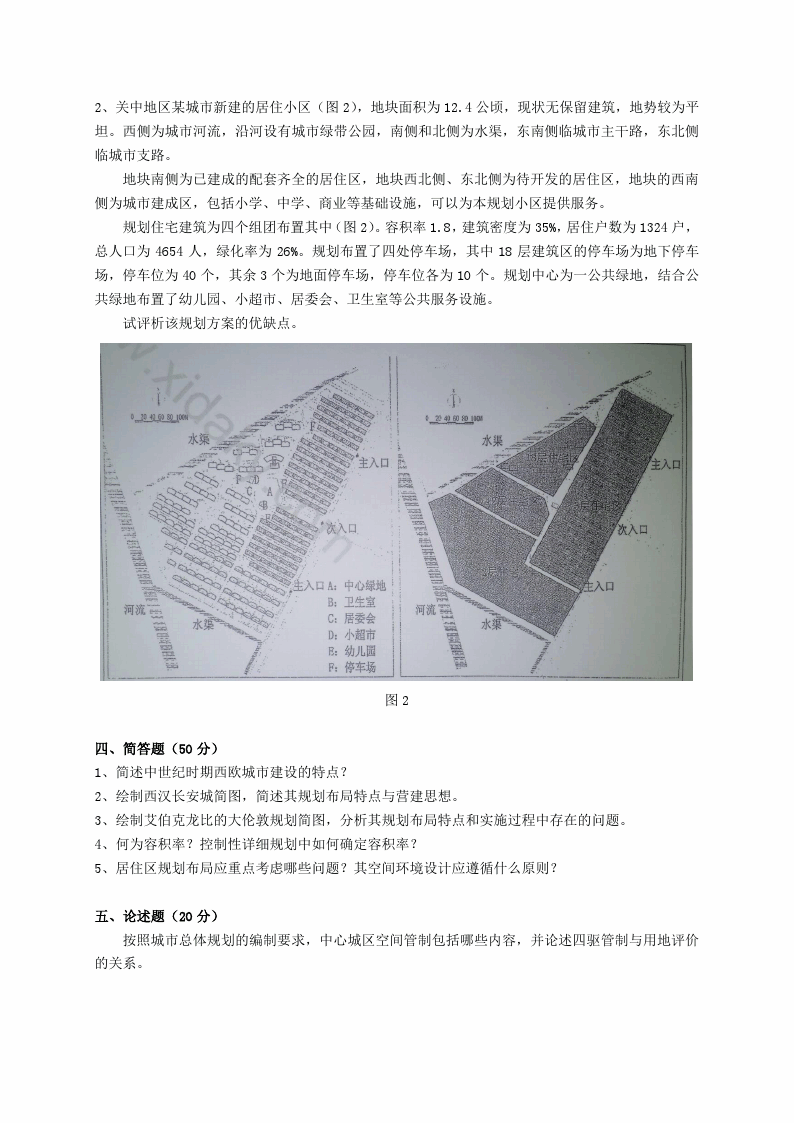 选择题: 城市性质定义、土地利用总体规划的主要目标、修建性详细规划的基本特征、下列选项中不属于居住区布置形式的是?、为减少城市**空间容量,处理**的顺序为? 名词解释: 1.城镇体系 2.慢行交通 3.城市意象 4.城市职能 5.容积率 6.(忘了) ...