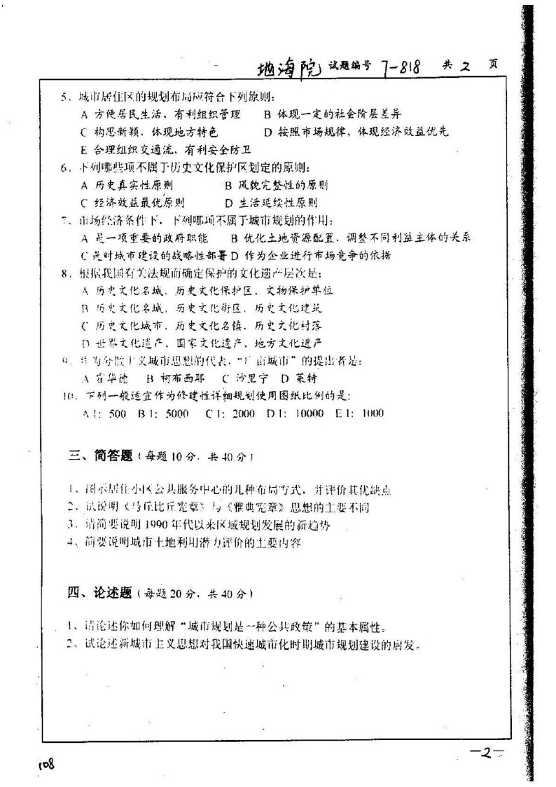 选择题: 城市性质定义、土地利用总体规划的主要目标、修建性详细规划的基本特征、下列选项中不属于居住区布置形式的是?、为减少城市**空间容量,处理**的顺序为? 名词解释: 1.城镇体系 2.慢行交通 3.城市意象 4.城市职能 5.容积率 6.(忘了) ...