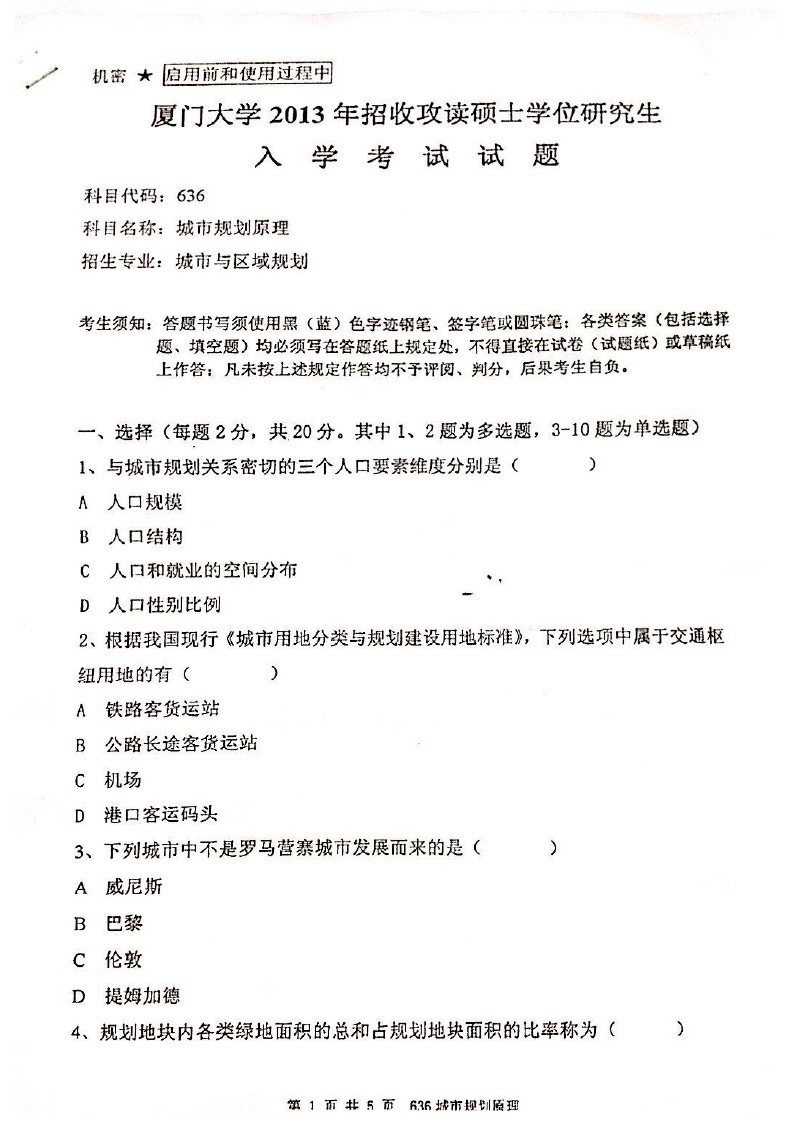 厦门大学2014-2010城市规划原理636半岛在线注册试题(10)