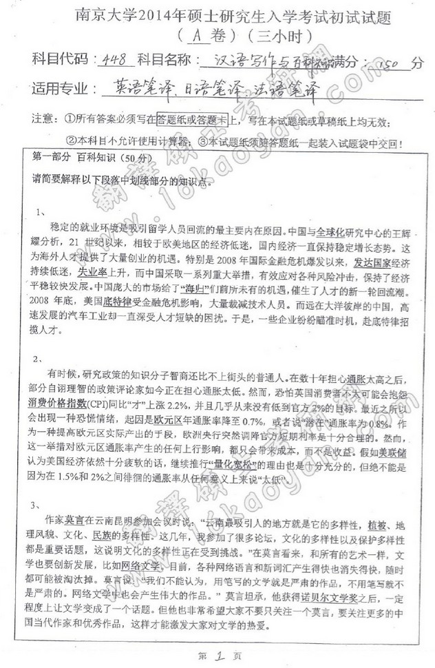 南京大学2014翻译硕士MTI半岛在线注册真题三科翻译硕士英语,英语翻译基础,汉语写作与百科知识(10)