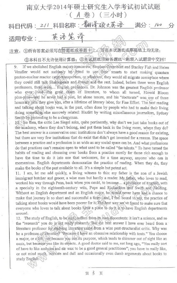 南京大学2014翻译硕士MTI半岛在线注册真题三科翻译硕士英语,英语翻译基础,汉语写作与百科知识(3)