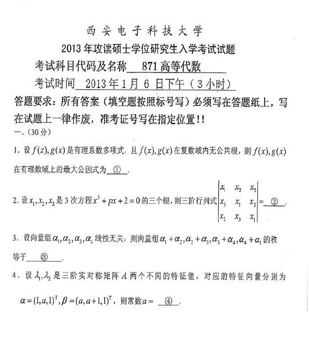 2013年西安电子科技大学高等代数871半岛在线注册真题