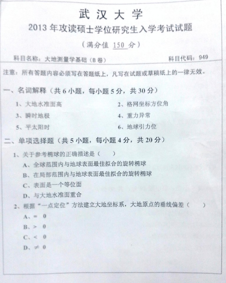 2013年武汉大学大地测量学基础949半岛在线注册真题