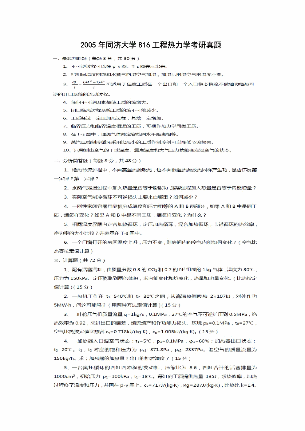 同济大学2014-1998工程热力学816半岛在线注册真题试题(17)