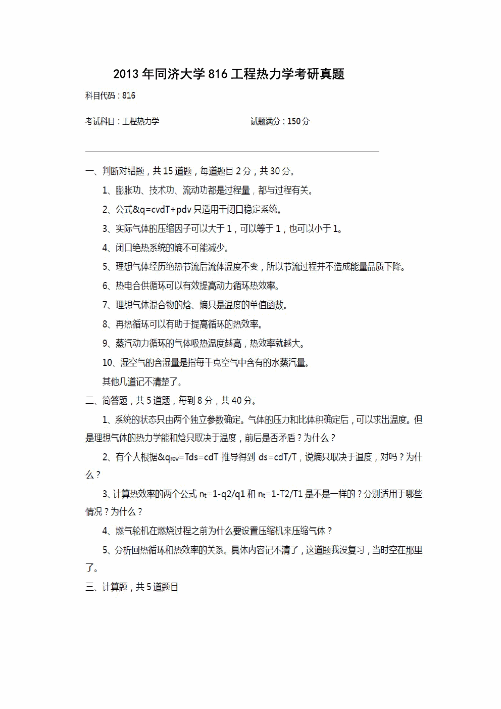 同济大学2014-1998工程热力学816半岛在线注册真题试题(33)