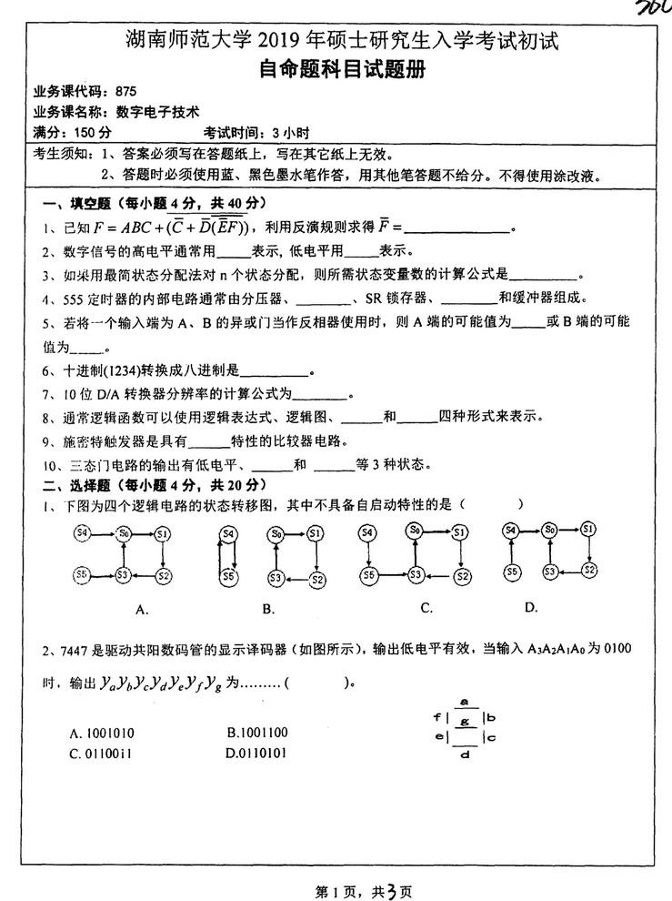 湖南师范大学2019电子科学与技术专业数字电子技术875半岛在线注册真题