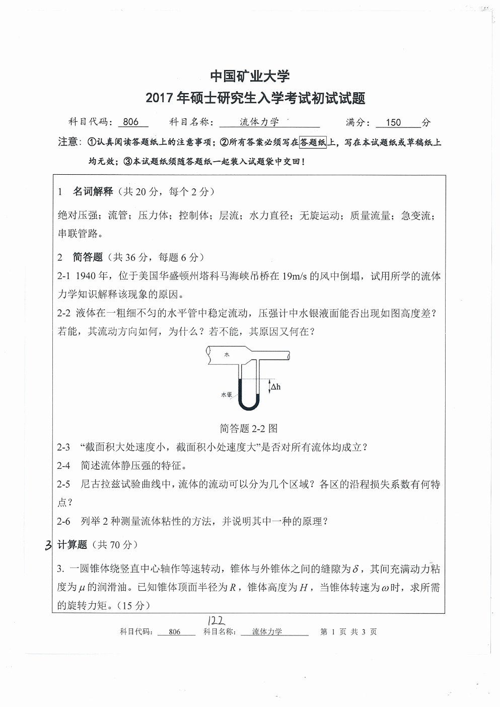 中国矿业大学徐州2017-2014流体力学806半岛在线注册真题(9)