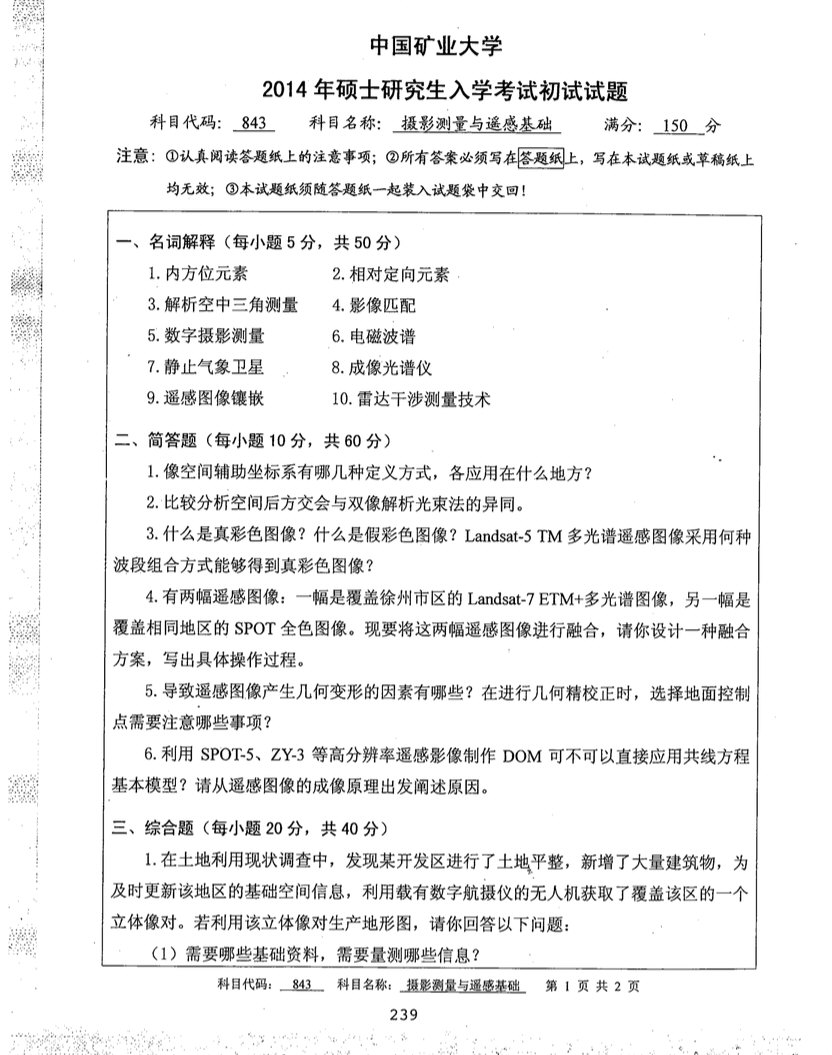 中国矿业大学2014-2013遥感原理与应用843半岛在线注册真题