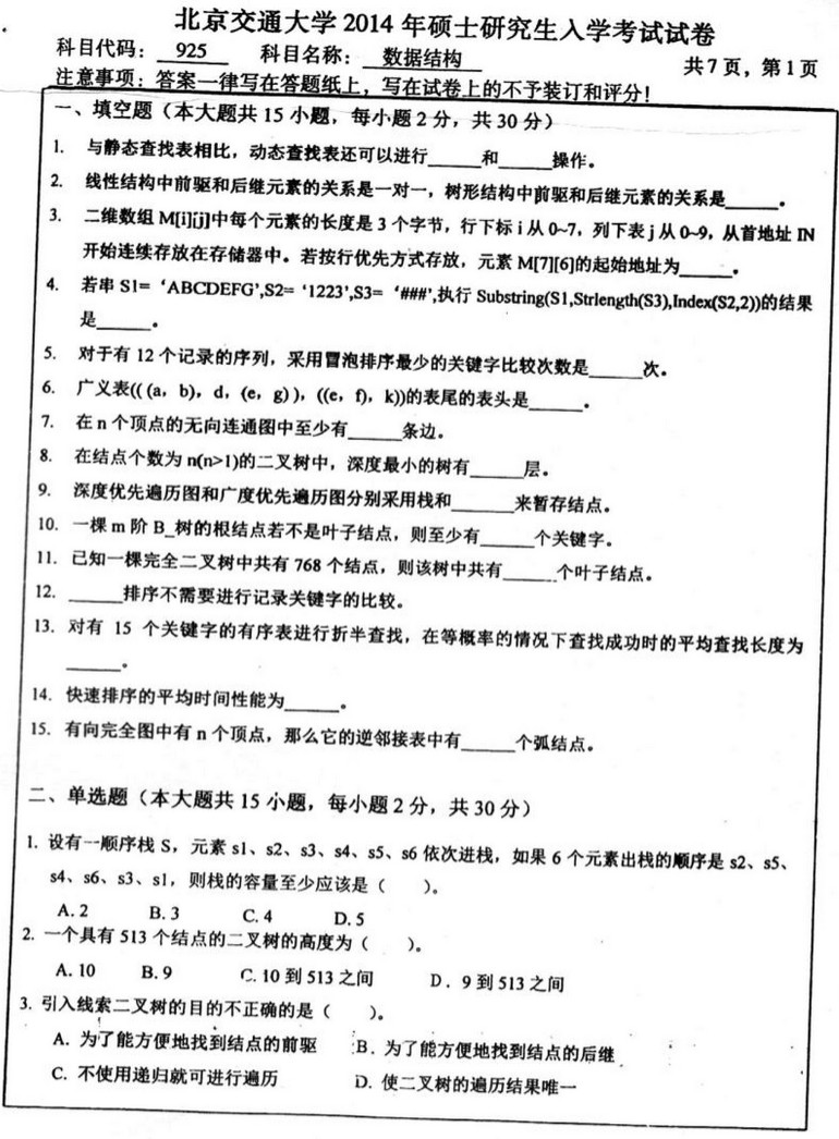 数据结构全是写算法前6题每道10分,第7题15分。