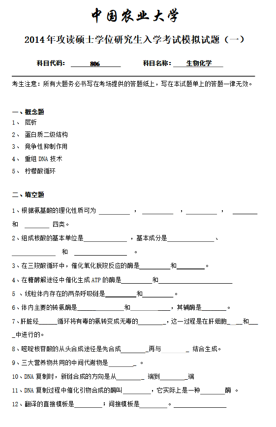 中国农业大学806生物化学2014年半岛在线注册考前最后二套题