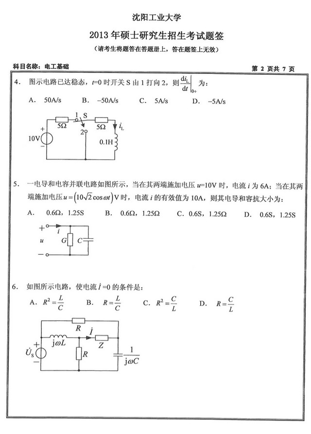 2013年沈阳工业大学804电工基础半岛在线注册真题(2)