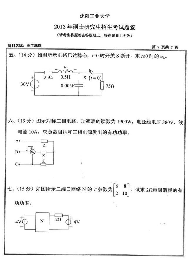 2013年沈阳工业大学804电工基础半岛在线注册真题(7)