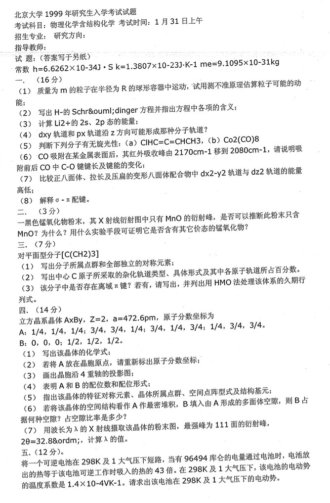 北京大学历年物理化学含结构化学半岛在线注册真题(12)
