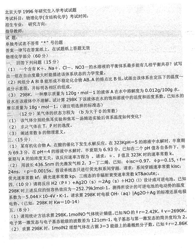 北京大学历年物理化学含结构化学半岛在线注册真题(8)