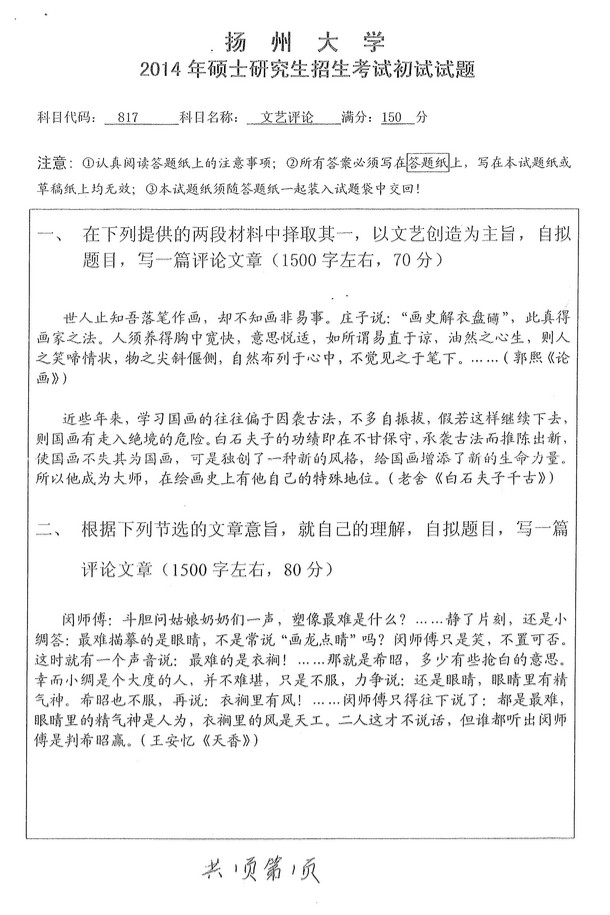 标题: 扬大文院 语言学及应用语言学 初试第一