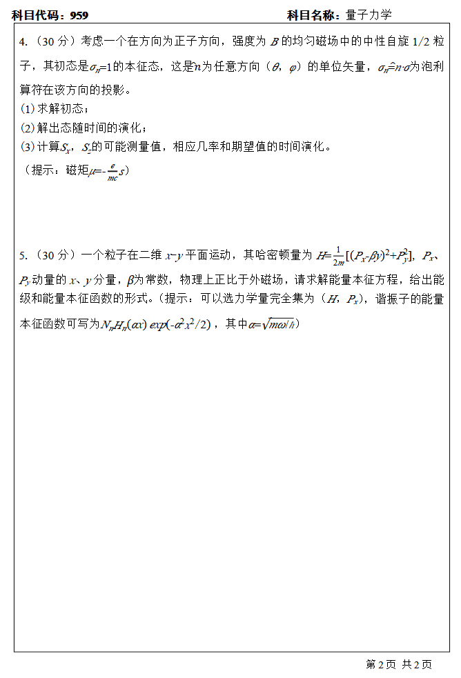 2018年北京师范大学959量子力学半岛在线注册试题(2)