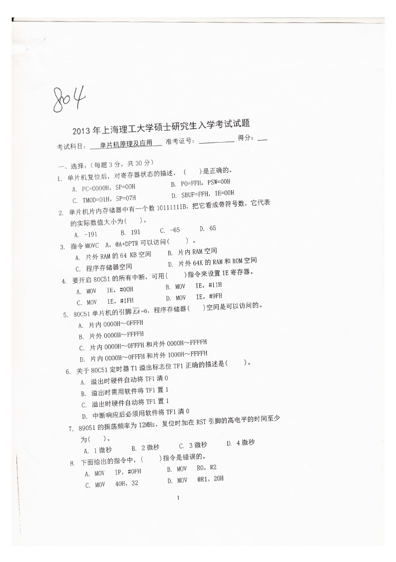 上海理工大学单片机原理及运用2007,2010-2014半岛在线注册真题汇编(54)