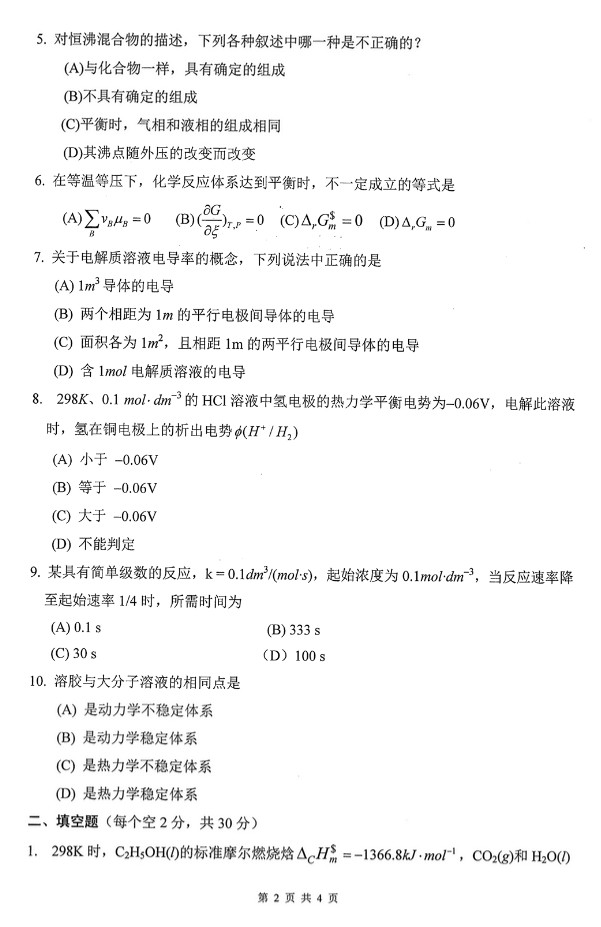 2009年云南师范大学822物理化学半岛在线注册真题半岛在线注册试题(2)