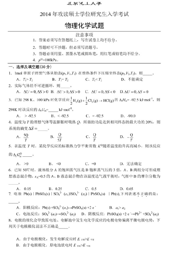 2014-2016年北京化工大学物理化学硕士半岛在线注册真题