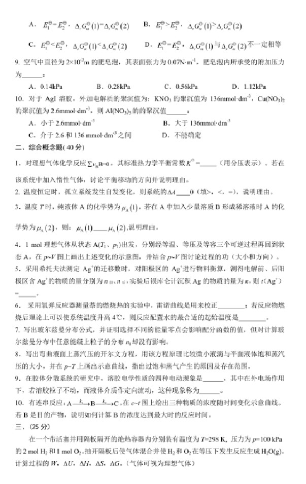 2014-2016年北京化工大学物理化学硕士半岛在线注册真题(6)