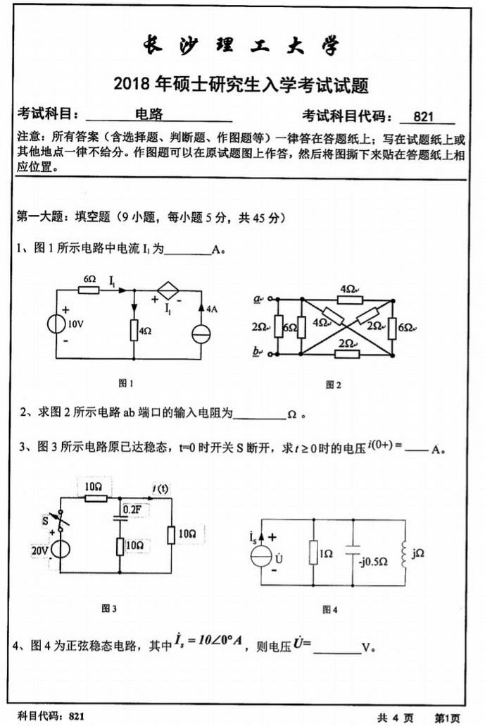 长沙理工大学2018年821电路半岛在线注册专业课真题试卷