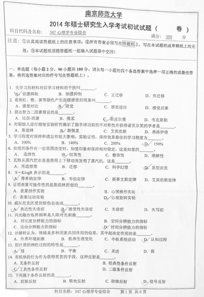 2014南京师范大学347心理学专业综合半岛在线注册试题