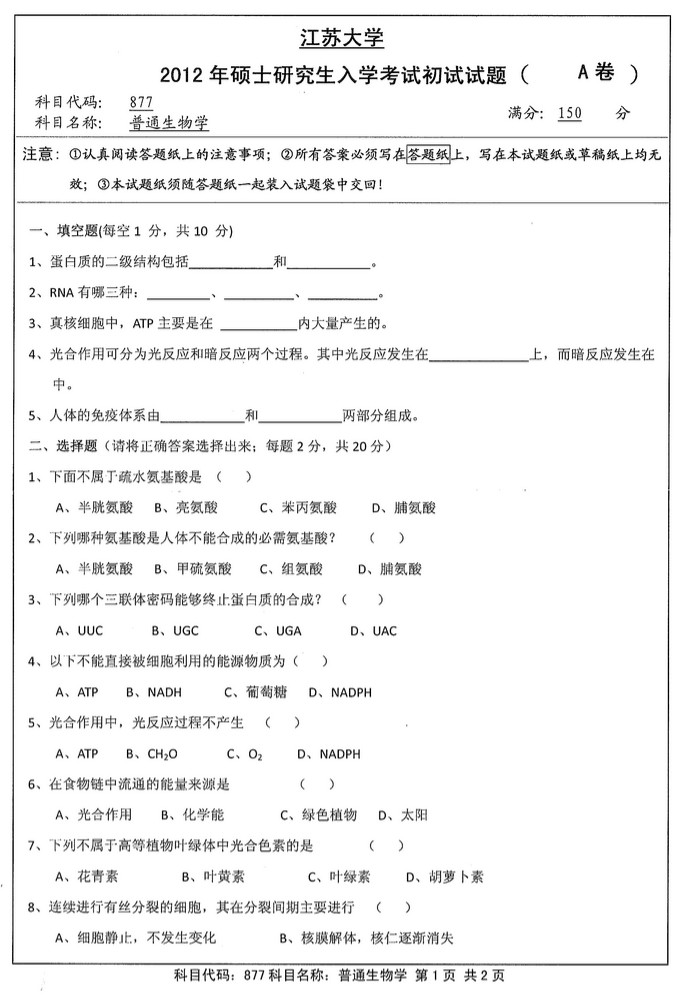 2010-2014江苏大学普通生物学复试历年半岛在线注册真题(5)