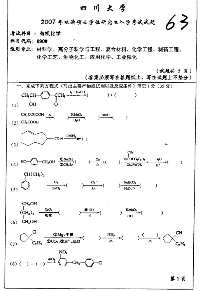 2007-2010年四川大学890有机化学硕士研究生半岛在线注册考试真题