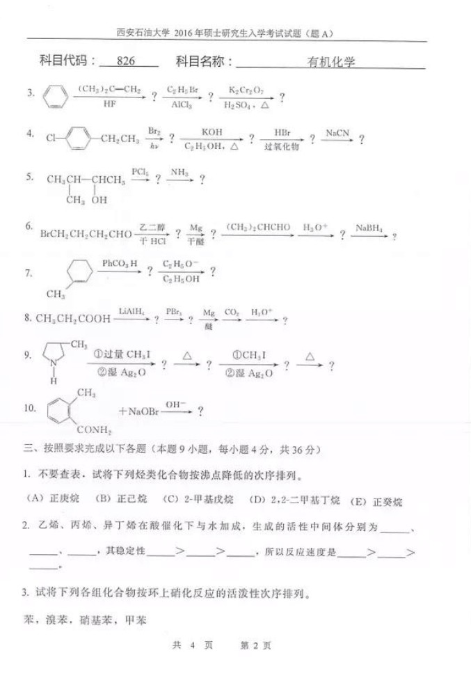 2016年西安石油大学826有机化学半岛在线注册真题(2)