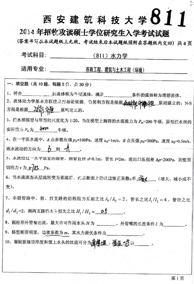 2014年西安建筑科技大学811水力学半岛在线注册真题带答案