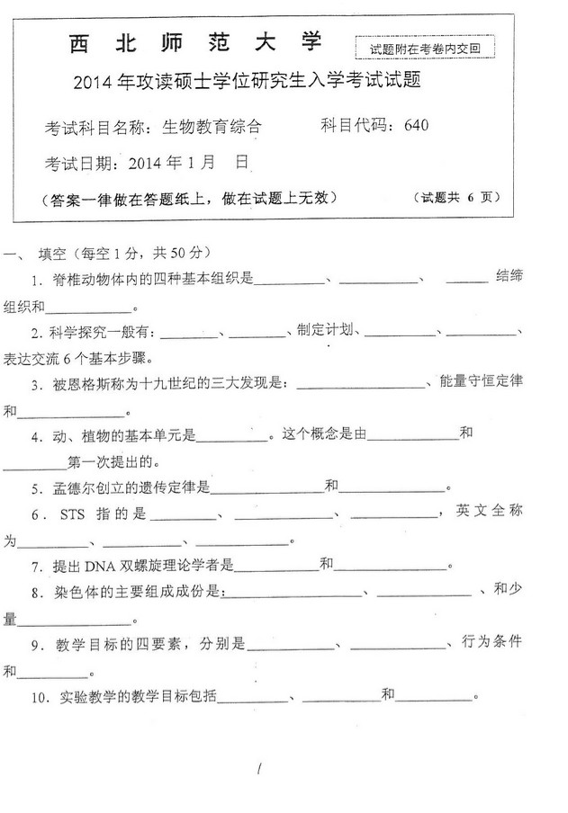 2014年西北师范大学640生物教育综合半岛在线注册试题