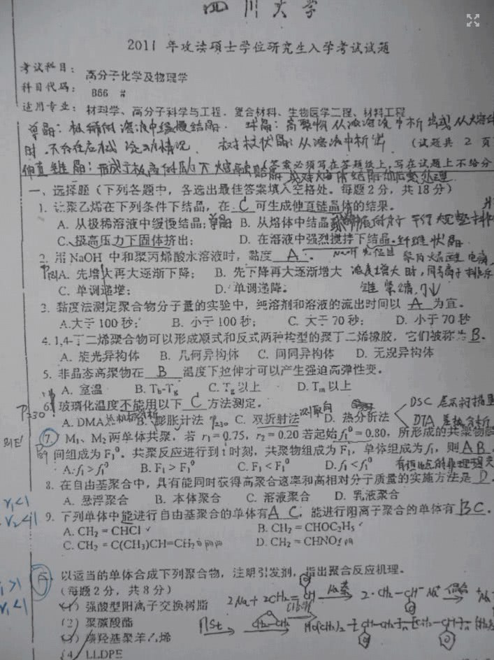 2011年四川大学高分子化学及物理半岛在线注册真题