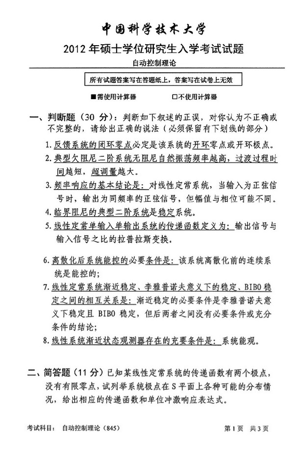 2012年中国科学技术大学自动控制理论半岛在线注册真题