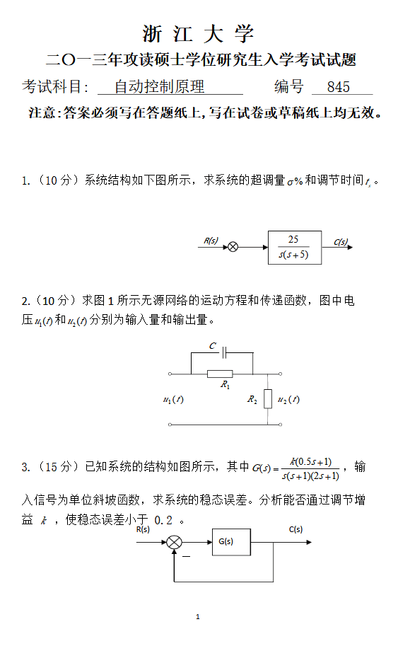 2013年浙江大学845自动控制理论半岛在线注册试题
